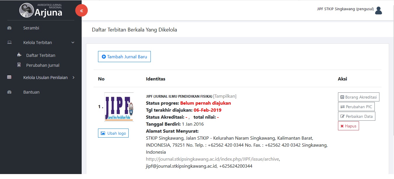 Jurnalnya sudah diajukan untuk akreditasi bu? Kalau sudah, tidak bisa direvisi.Lidia widia wrote:mau tanya bagaimana caranya untuk revisi (PERBAIKAN DATA) di ARJUNA,,