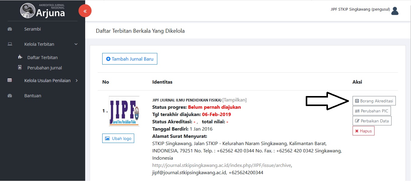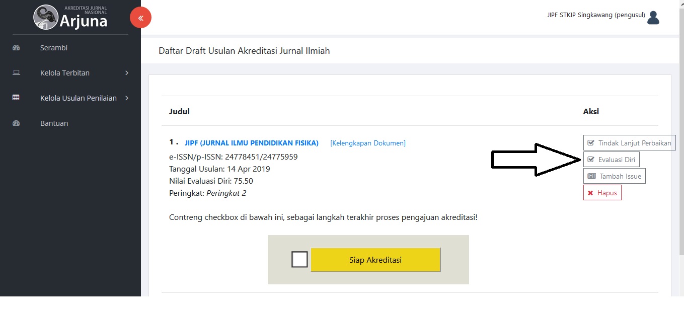 1. Buka Daftar Terbitan Berkala Yang Dikelola 2. Klik Borang Akreditasi (Lihat Panah) 3. Klik Evaluasi Diri (Lihat Panah)