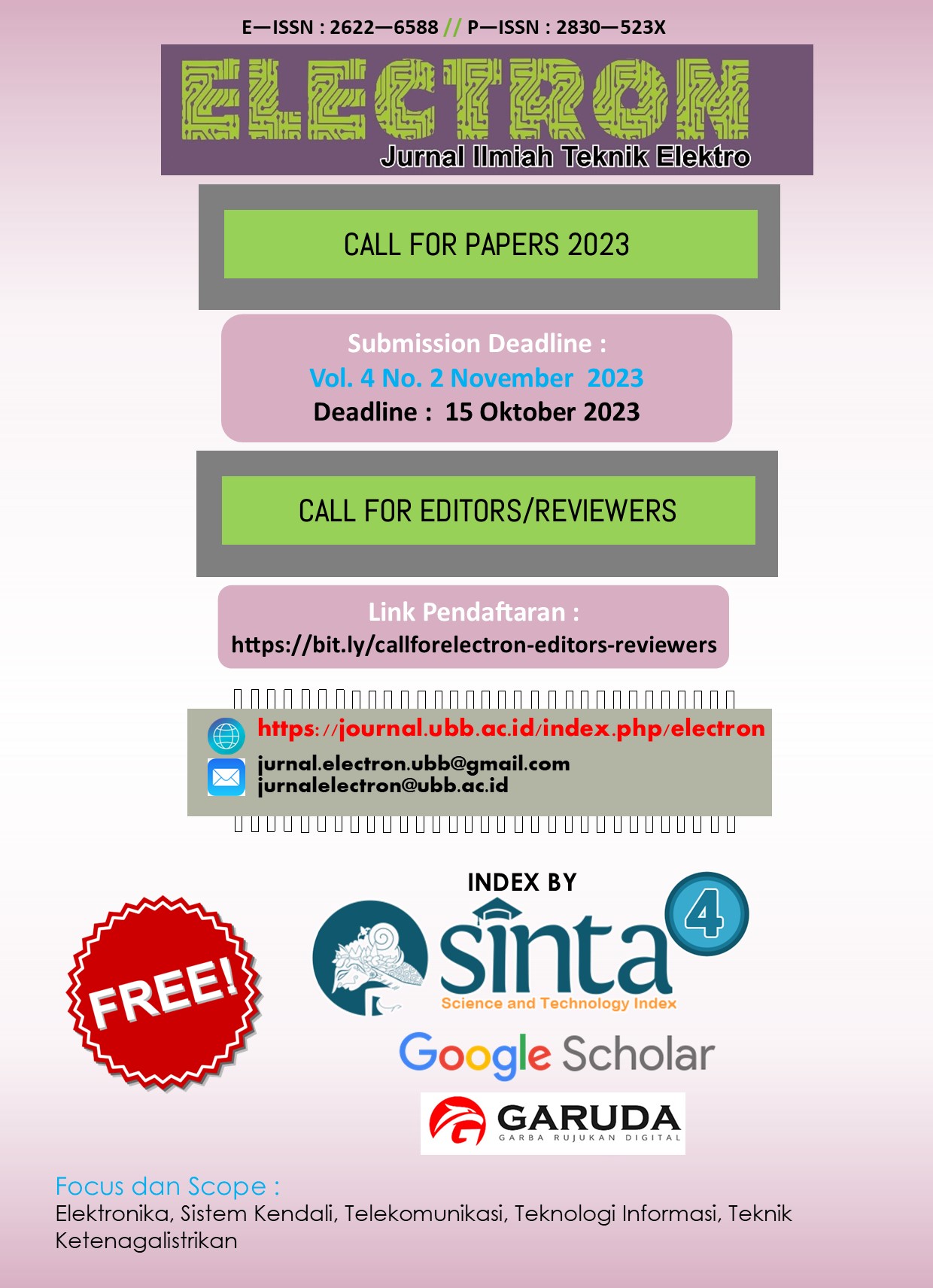 Kami mengundang seluruh profesional, peneliti, dan praktisi untuk menerbitkan artikel dan menjadi reviewer di E- Jurnal Jurusan Teknik Elektro, Fakultas Teknik, Universitas Bangka Belitung (TE UBB). E-journal ini merupakan wadah publikasi dan informasi terhadap hasil karya tulis, skripsi, penelitian, konsep perencanaan dan perancangan, maupun analisa dari mahasiswa, dosen atau penulis lainnya yang berisi berbagai kajian dengan bidang keilmuan Teknik Elektronika, Teknik Kendali/Kontrol/Pengaturan, Teknik Telekomunikasi dan Teknik Ketenagalistrikan. Jurnal ini diterbitkan dua kali setahun di bulan Mei dan November. Saat ini Jurnal Electron telah terakreditasi Sinta 4. Artikel dalam E-jurnal ini belum pernah dipublikasikan di jurnal ilmiah lainnya.