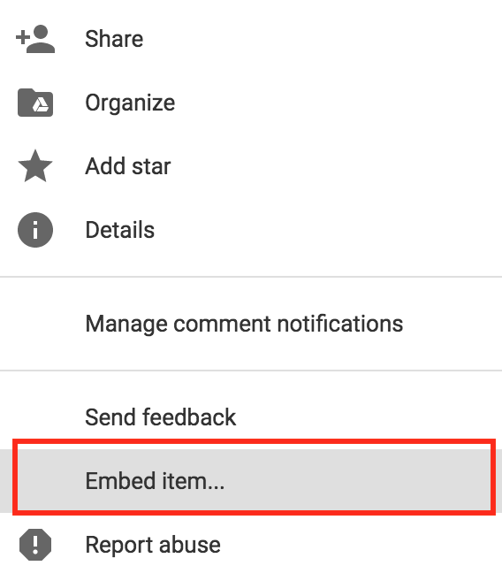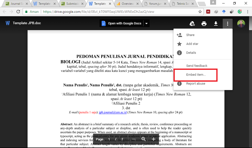2. Upload file yg diinginkan ke google drive 3. Klik Embed item (letak kanan atas di kotak merah) 4. Copy code HTML tersebut