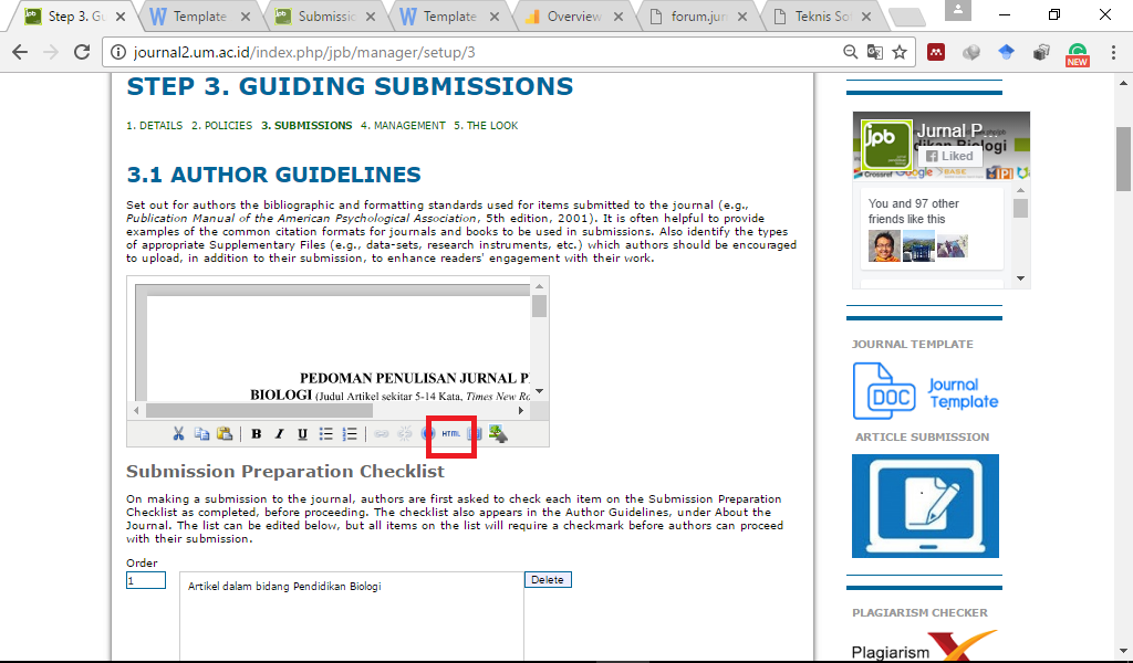 8. Pada kolom Author Guidelines, klik html 9. Paste code HTML dari google drive tadi