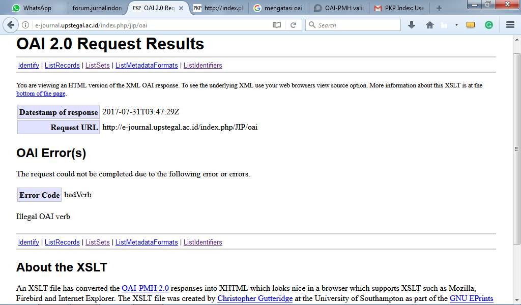 error sebenarnya ketika linknya hanya http://e-journal.upstegal.ac.id/index.php/jip/oai (kurang perintah)