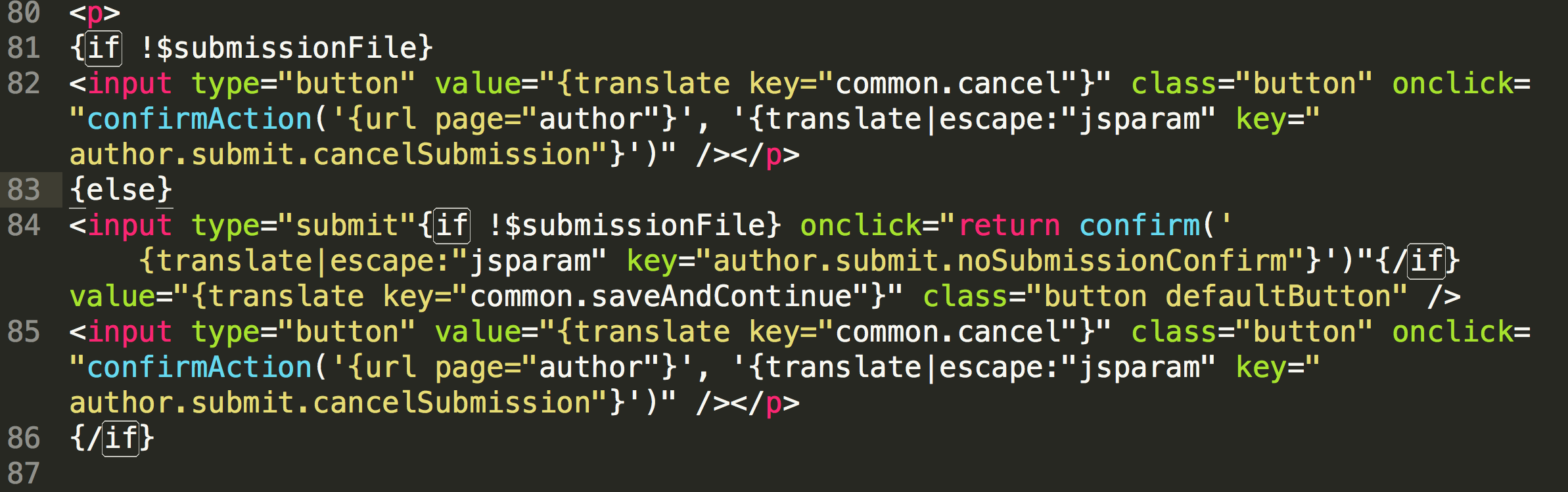 {if !$submissionFile} <input type="button" value="{translate key="common.cancel"}" class="button" onclick="confirmAction('{url page="author"}', '{translate|escape:"jsparam" key="author.submit.cancelSubmission"}')" /></p> {else} <input type="submit"{if !$submissionFile} onclick="return confirm('{translate|escape:"jsparam" key="author.submit.noSubmissionConfirm"}')"{/if} value="{translate key="common.saveAndContinue"}" class="button defaultButton" /> <input type="button" value="{translate key="common.cancel"}" class="button" onclick="confirmAction('{url page="author"}', '{translate|escape:"jsparam" key="author.submit.cancelSubmission"}')" /></p> {/if}