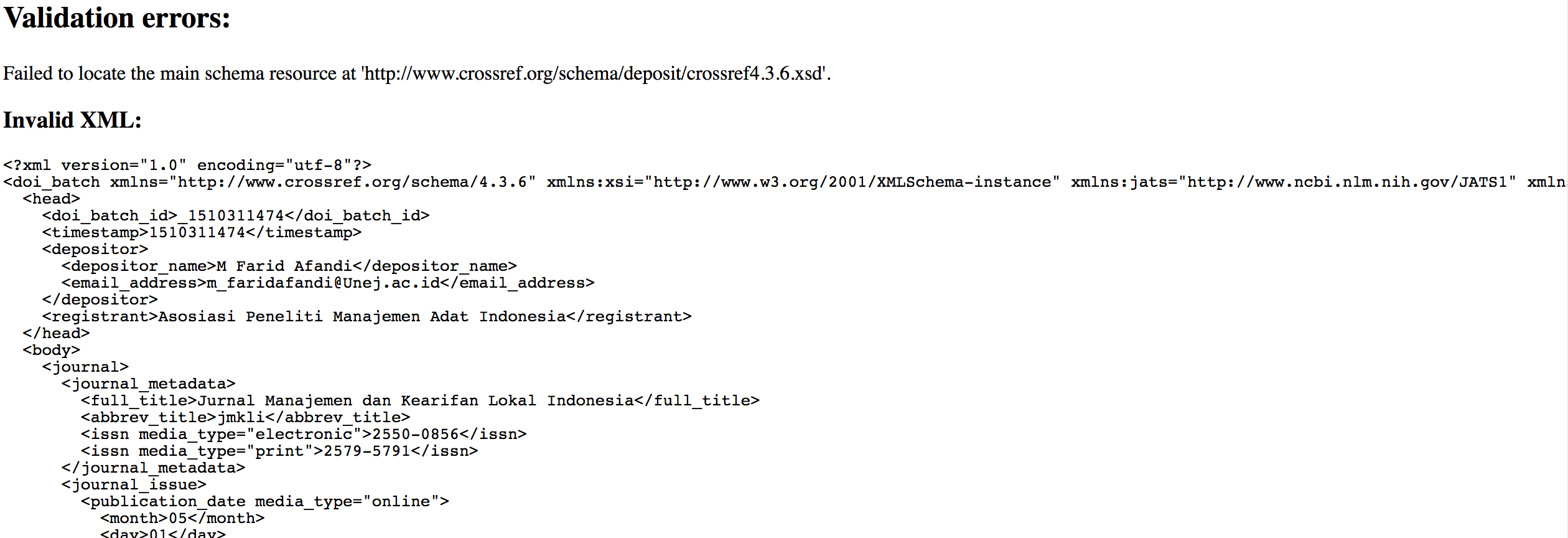 Kasus di OJS 3.0.2 ketika mau export XML Crosreff Error , muncul pesan :