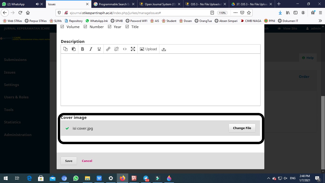 Mau bertanya dan share permasalah jurnal saya. Saya upload cover berhasil di jurnal namun tidak bisa tertampilkan. Apakah ada yang punya solusi untuk permasalah jurnal saya tersebut.