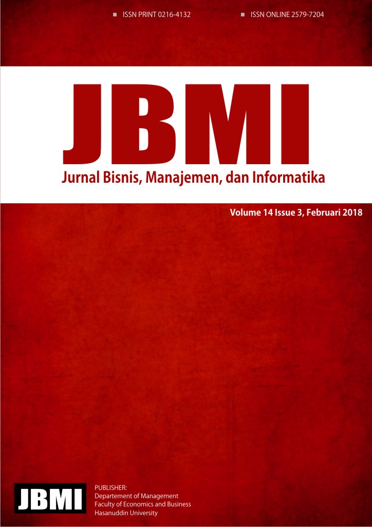 Jurnal Bisnis Manajemen & Informatika (JBMI) dengan ISSN: 0216-4132 diterbitkan oleh Jurusan Manajemen, Fakultas Ekonomi dan Bisnis Unhas, adalah berkala ilmiah yang berusaha untuk turut aktif dalam usaha-usaha penemuan/pengembangan, penyebaran dan penerapan ilmu bisnis, manajemen, dan informatika, sehingga dapat mengintegralkan aspek teoritis-akademis dan praktis-empiris dalam bidang-bidang tersebut, untuk membantu menumbuhkan ilmuwan dan praktisi yang profesional dan produktif dalam membangun masyarakat Indonesia. Jenis tulisan yang diharapkan dapat berupa: hasil penelitian empiris, artikel terapan, kajian teoritis mendalam atas konsep kontemporer atau isu metodologis, dan tinjauan serta tanggapan.