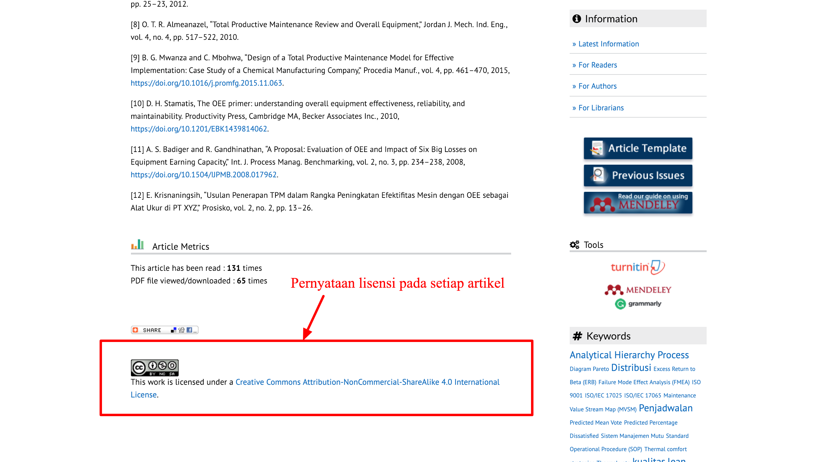 Lisensi sesuai artinya adalah izin yang diberikan kepada pihak ketiga oleh penulis melalui jurnal/penerbit. Apa saja lisensi tersebut bisa dipakai atau dipilih dari yang diberikan oleh Creative Commons pada alamat https://creativecommons.org/choose/. Di Creative Commons ada 6 jenis lisensi yang memungkinkan penulis dan/atau penerbit memberikan lisensi pemakaian hasil ciptaan (tulisan artikel adalah hasil ciptaan) kepada pembaca atau pengunjung laman web jurnal. DOAJ menginginkan lisensi ini konkrit disebutkan dan ditampilkan di laman web jurnal. Pada setiap artikel, bukan hanya di bagian footer laman web saja. Contohnya pada artikel di halaman Jurnal Optimasi Sistem Industri ini (http://josi.ft.unand.ac.id).