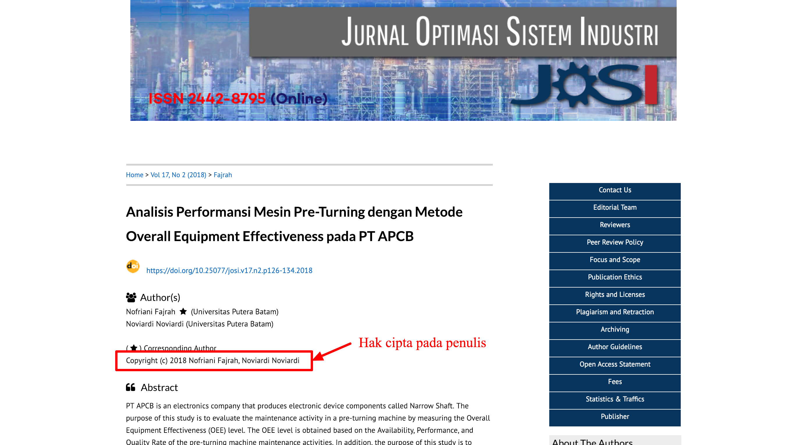 Sekedar contoh saja, dan tidak perlu diikuti teks per teks nya, ini adalah contoh halaman pernyataan Hak Cipta dan Lisensi pada salah satu jurnal (http://josi.ft.unand.ac.id/index.php/jo ... ightNotice). Ini bukan contoh yang paling sempurna, atau paling baik, tetapi ini sesuai dengan yang diharapkan oleh jurnal.