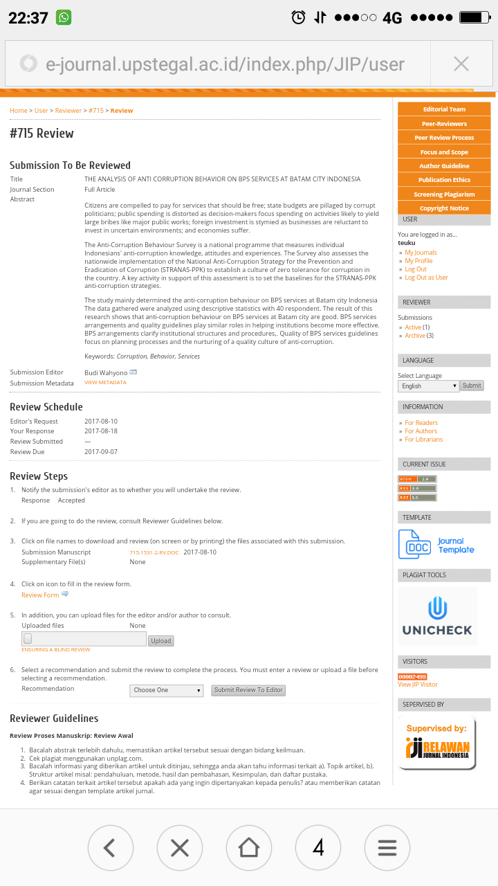 Mohon pencerahannya apabila di account reviewer tidak bisa upload file .doc hasil review. Selalu nihil setelah klik upload dan tidak terecord.