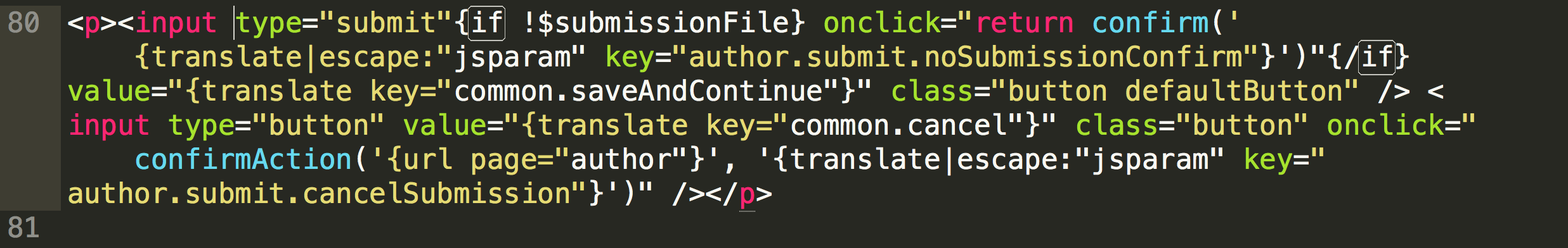 <input type="submit"{if !$submissionFile} onclick="return confirm('{translate|escape:"jsparam" key="author.submit.noSubmissionConfirm"}')"{/if} value="{translate key="common.saveAndContinue"}" class="button defaultButton" />